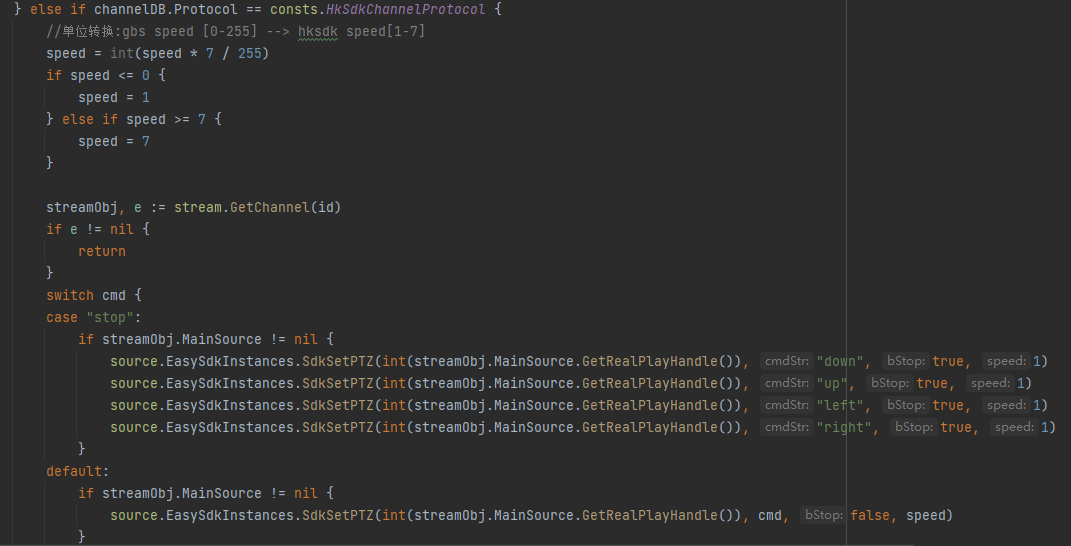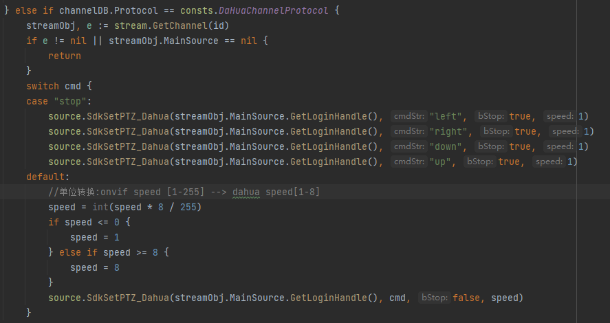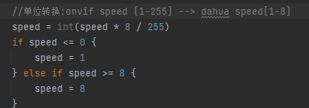 3、于是添加一个大华设备的处理逻辑即可。但其中有一点需要注意:因为国标传过来的速度是:[0-255],而大华设备的速度是:[1-8],需算出云台移动的速度转换一下;