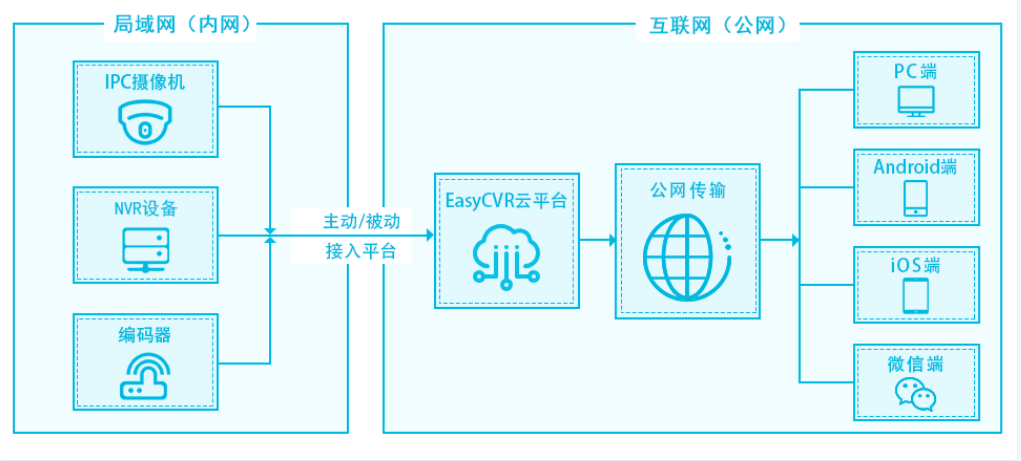 EasyCVR平台支持多种协议、多种类型的设备接入,可以实现视频直播、转码与分发、平台级联、云台控制等,拥有灵活丰富的视频能力。平台基于云边端一体化架构,可在复杂的网络环境中,将分散的各类视频资源进行统一汇聚、整合、集中管理,在很多场景中均有落地项目应用,如智慧工地、智慧安防、智慧工厂、智慧园区等。