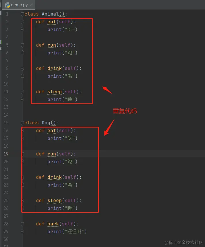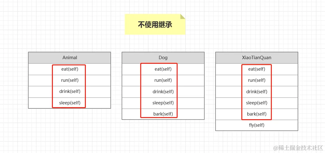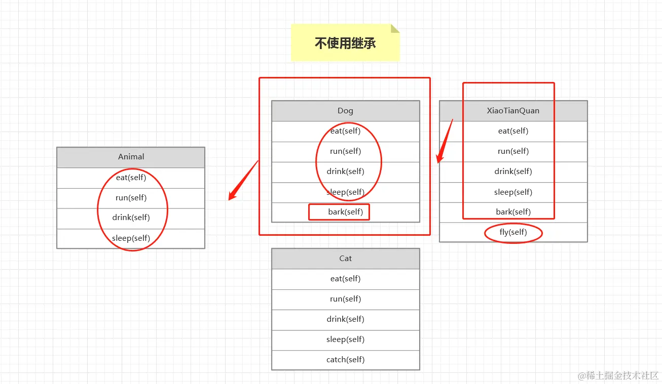 下面看一张图,可以看出动物类,和狗类,还有哮天犬类都有很多重复的方法代码,这样大大降低了代码的效率,产生很多重复的代码,修改代码也变得麻烦了起来。比如我要修改动物类的吃方法,那么狗类中的吃方法也要重复修改一遍很麻烦等情况,那么解决这个问题就可以用到面向对象中的继承特性来解决。