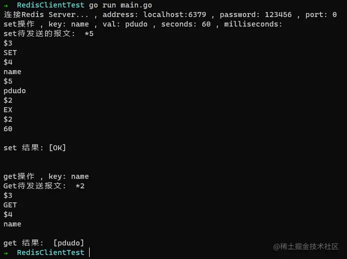 如上代码,我们连接到了本地Redis,并且设置了一个key,名称为name,值为pdudo,ttl为60秒,而后再查询了一下name的值,我们加了一些日志,我们来看下具体执行过程:
