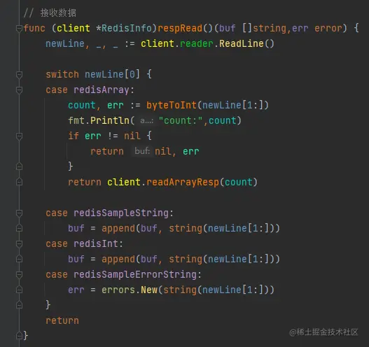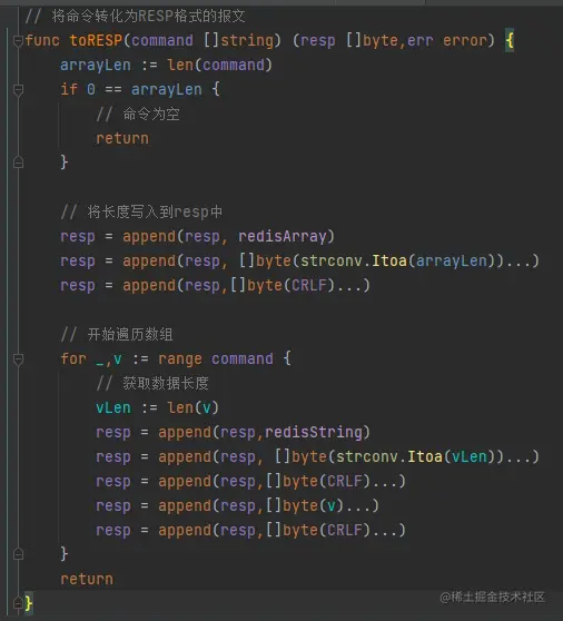 如上代码表示接收的数据中,先计算数组command的长度,且写入到[]byte中,接着再循环遍历command,最后计算每个v的长度,以复杂字符串的类型$写入到[]byte中。