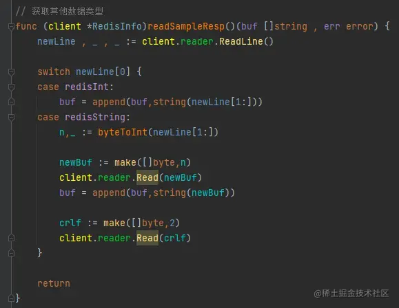 基于如上特性,若没有数组类型的话,而一旦使用了数组,该协议报文中,就不可能出现+``-等数据类型,仅有$以及:,基于此我们很容易写出代码来: