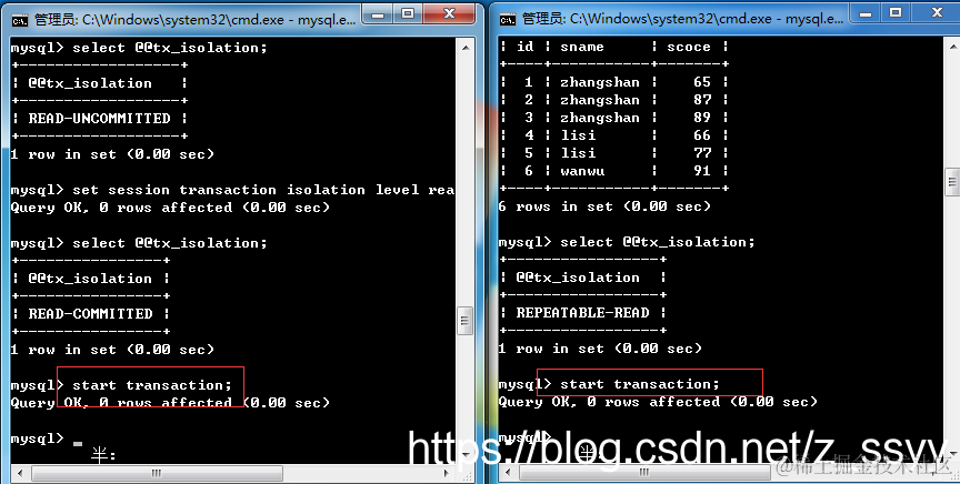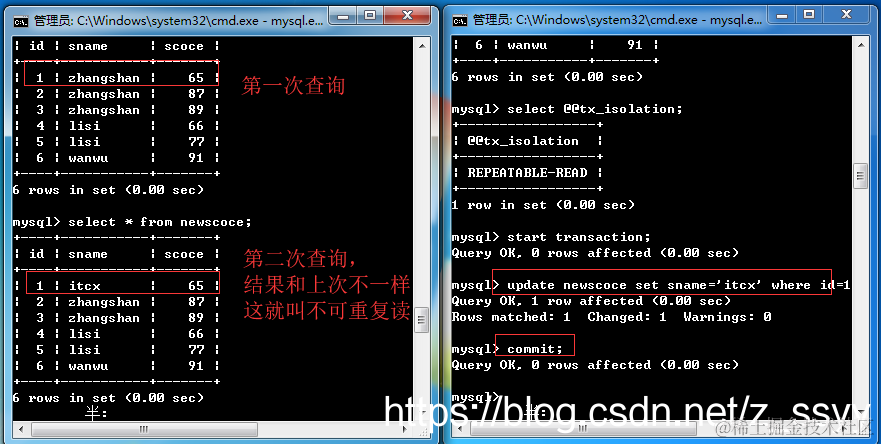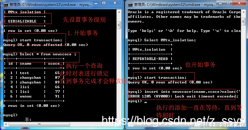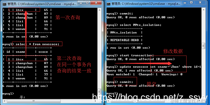 打开两个MySql的命令提示行,均进入相同数据库,并检查当前表内容为相同数据如下:【数据表要支持事务】
