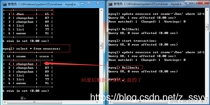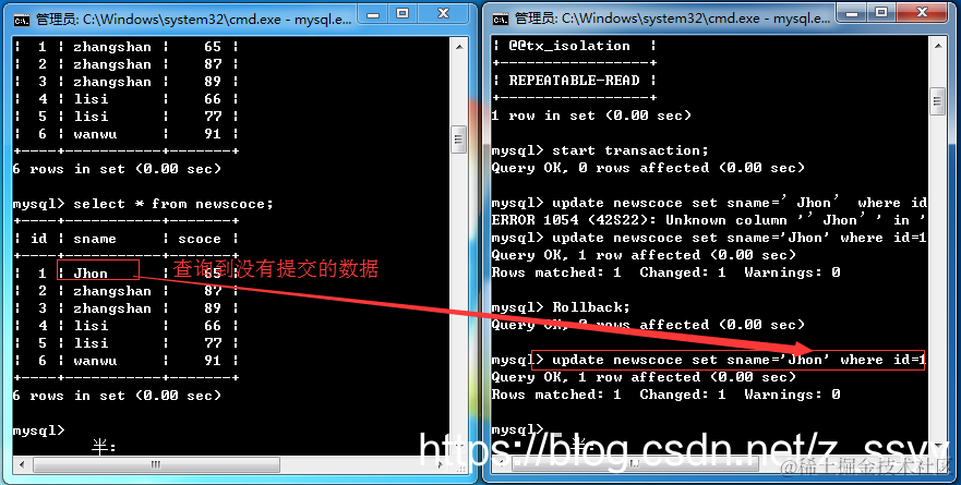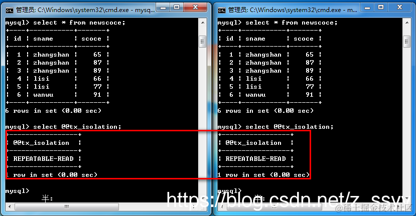 在A端开启一个事务 start transaction; 并对Select * from newscoce ;表进行查询。
