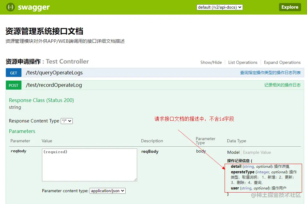 这种场景下,我们就希望提供出去的接口文档中,在对recordOperateLog接口的请求body体中字段说明的时候,就不要体现出id字段,避免让调用方产生疑惑,不知道id调用的时候应该如何赋值。我们可以通过在指定字段上添加@ApiModelProperty注解并指定hidden = true来将其从接口文档中隐藏掉。