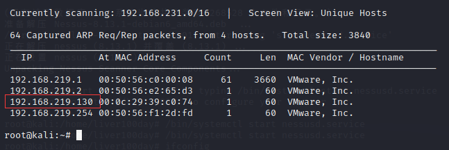 接下来,使用kali命令netdiscover对网络存活主机进行发现