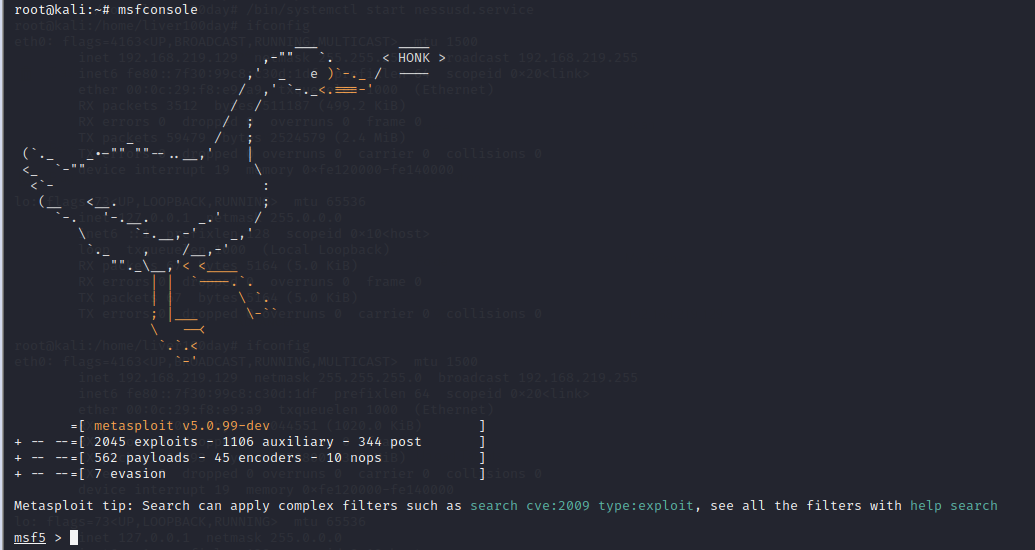 4.获取kali自身的IP地址 使用命令 ifconfig,和windows版本不同。windows下查看IP命令为ipconfig