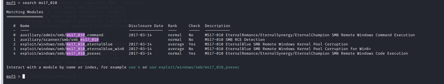 其中auxil iary/ scanner/ smb/ smb/ms17010为扫描模块,用于对目标是否存在永恒之蓝漏洞进行确认