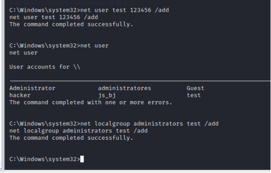 net localgroup administrators test /add 将test用户拉入管理员组,提升为管理员用户