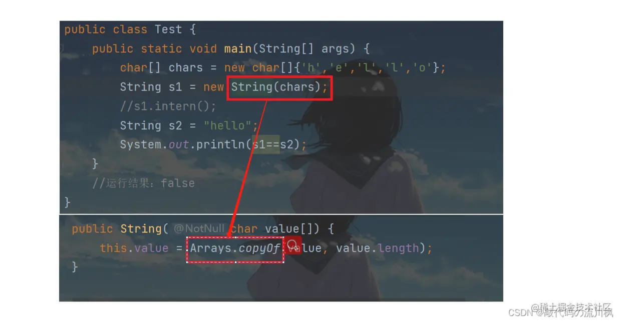 现在堆上创建一个String对象,然后利用copyof将重新开辟数组空间,将参数字符串数组中内容拷贝到String对象中