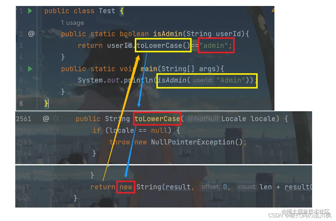然后isAdmin()方法中的"admin"是存放在字符串常量池中的,userId.toLowerCase()是new出来的,回的是一个新的对象