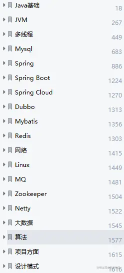 文档涵盖 Java 基础,设计模式,JVM,多线程,Mysql,Spring,Spring Boot,Spring Cloud,Dubbo,Mybatis,Redis,网络,Linux,MQ,Zookeeper,Netty 甚至大数据算法项目方面,足足有 1658 页,可以说是比较全的了。篇幅限制就只为大家展示目录跟部分内容了,需要完整版的小伙伴评论区见哦