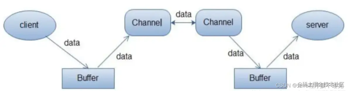 上面的图描述了从一个客户端向服务端发送数据,然后服务端接收数据的过程。客户端发送数据时,必须先将数据存入Buffer 中,然后将Buffer中的内容写入通道。服务端这边接收数据必须通过Channel将数据读入到Buffer中,然后再从Buffer中取出数据来处理。