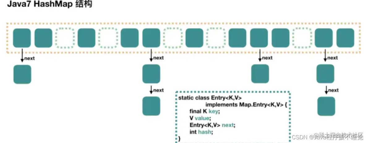大方向上,HashMap里面是一个数组,然后数组中每个元素是一个单向链表。上图中,每个绿色的实体是嵌套类Entry的实例,Entry包含四个属性:key、value、hash值和用于单向链表的next。