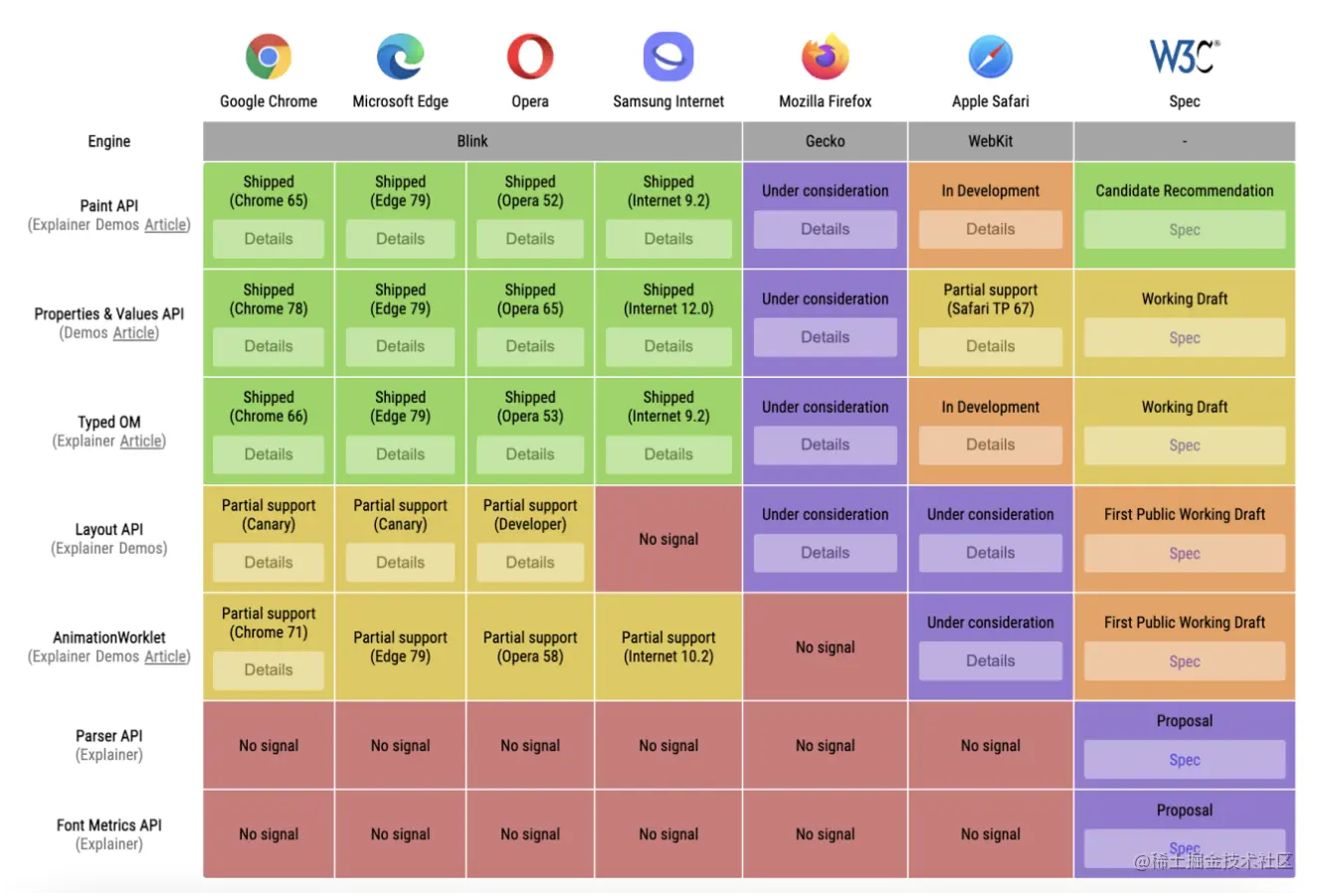 首先是浏览器支持现状,如图(截止到21年5月,后面没有更新了🐶)。可见对于基础的Typed OM,priperties以及Paint API各方面支持的还挺不错,Safari也都在逐步支持中。而Layout 和 Animation等则依旧比较遥远。