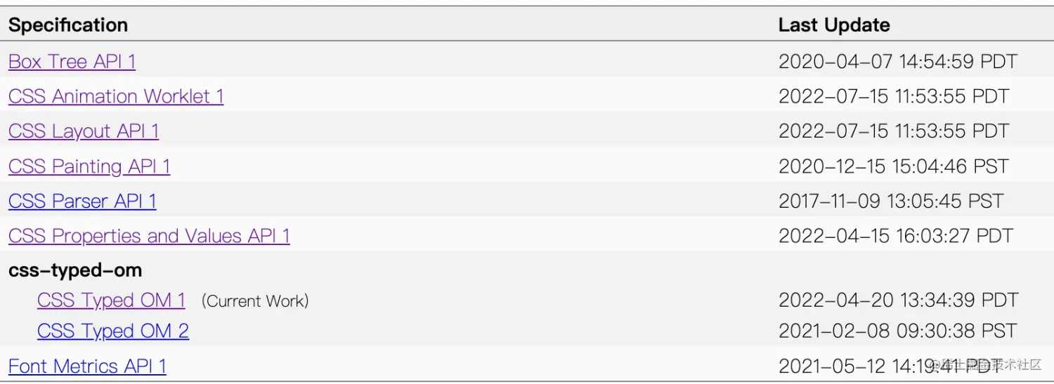 W3C规范中将Houdini API包含了Painting API、Parser API、Properties and Values API、Typed OM、Font Metrics API 、Layout API、Animation Worklet、Box Tree API。