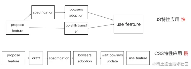 不同于JS新特性可以通过类似babel等transform或者polyfill的方式来较快的使用上。CSS的新特性会经历长期的规范推进和浏览器厂商实现最后到浏览器版本覆盖才能够很好的使用。CSS的polyfill受制于浏览器限制,能够影响到渲染部分的阶段及其有限(DOM操作和部分CSSOM操作),而且很容易触发浏览器渲染步骤导致性能问题。所以它设计之初是为了解决这种CSS的新特性需要长周期才能适用的情况。