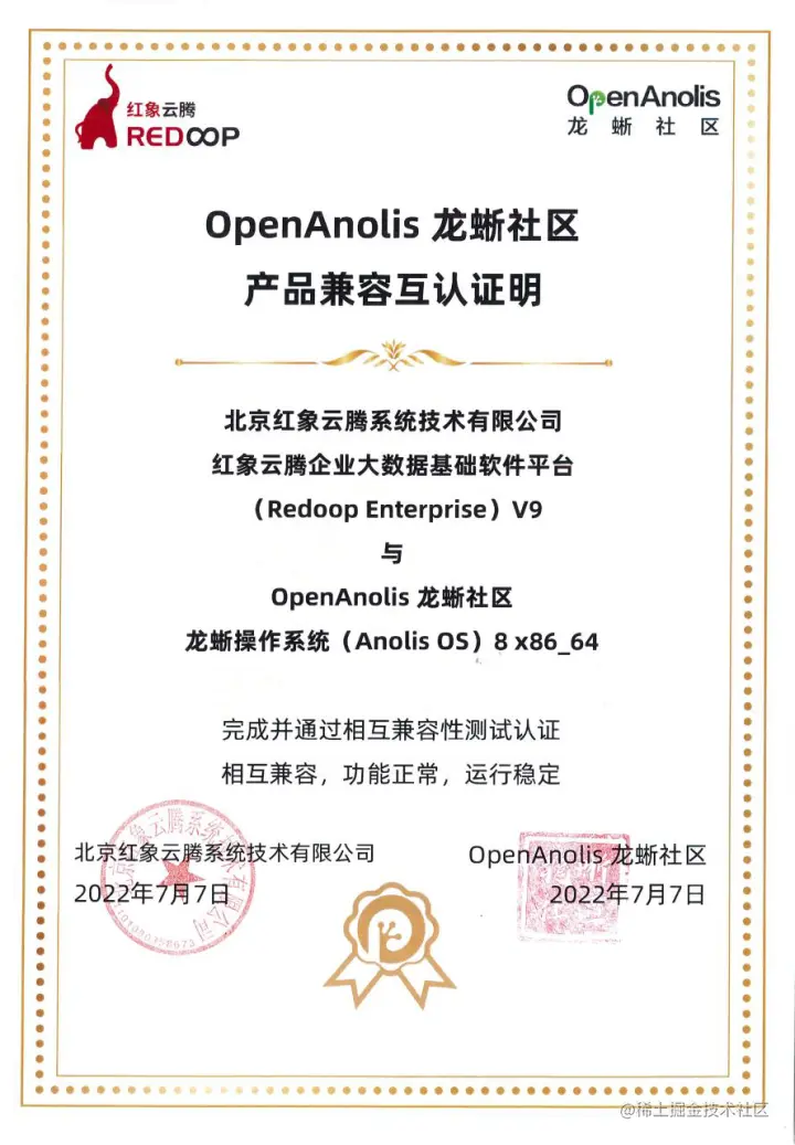 最近红象云腾大数据产品与生态伙伴的适配工作喜报频传,不久前,红象云腾大数据基础软件平台产品与龙蜥操作系统(Anolis OS)8 AArch64 完成了兼容测试,近日,红象云腾与龙蜥社区工作人员再次联合严格测试,红象云腾企业大数据基础软件平台(Redoop Enterprise)V9 完成了与龙蜥操作系统(Anolis OS)8 x86_64 的兼容适配,完成并通过相互兼容性测试认证,相互兼容,功能正常,运行稳定。