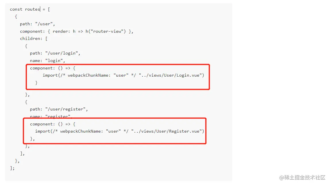component: () => { import(/* webpackChunkName: "user" */ "../views/User/Register.vue") }