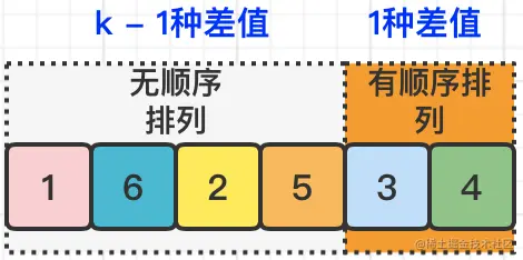 确定了数组中第一个值为1之后,我们来安排一下其他元素,根据第一张图,我们可以得知,如果数组中的元素是按照顺序排列的话,每个相邻节点的差值就是1,所以,这就是我们得出的第1个差值。那么针对于第二个参数k值。我们就可以将整个数组分为两部分排列:无顺序排列 + 有顺序排列。类似如下这种情况: