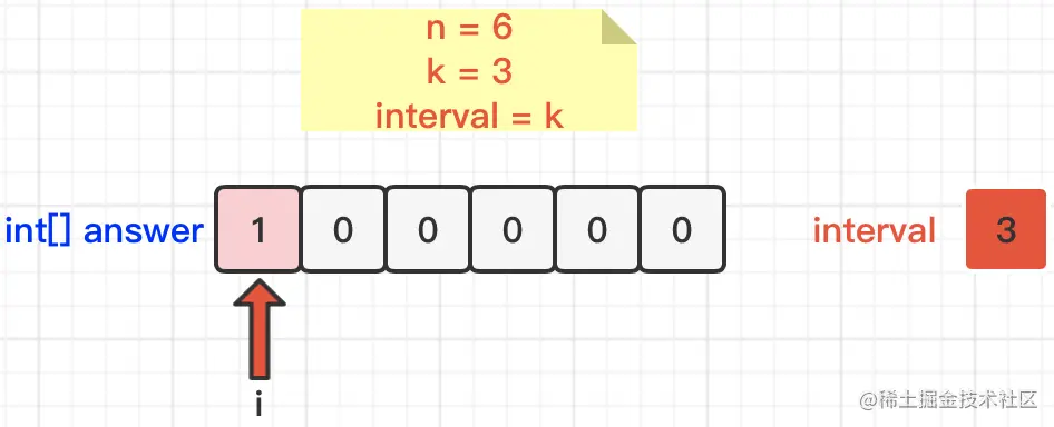 那么,在最后,我们只需要将有序排列的数组构建出来就可以了。由于跳跃区间interval我们初始化为k,并且上面只构建了数组中前k+1个元素的,这里面除去1之外最小值为:minValue = 2,最大值为:maxValue = k + 1。而我们当前的下标是i,i = maxValue + 1;所以假设answer[i]=i,则answer[i]与minValue的差值等于 (maxValue + 1) - 2 = ( k + 1 + 1) - 2 = k。而k值已经包含在了前[0, i -1]的数组区间内了。那么,我们就可以直接通过answer[i] = i + 1去构造有序排列了。如下所示: