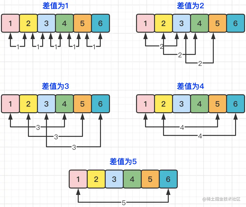 根据题目描述,方法入参由两个参数,第一个参数是n,我们可以得到一个数组[1, 2, 3, 4, ... , n]。第二个参数是k,表示当我们遍历数组,计算相邻两个元素的差值(取绝对值)的时候,有且仅有k个不同的整数。那么,针对这个数组,差值一共能有多少种情况呢?我们以下图为例,给出一个数组[1, 2, 3, 4, 5, 6],我们发现,一共能获得5中不同的差值。那么,我们其实可以得出一个结论,一个长度为n的数组,其差值就在[1, n-1]的区间内,详情如下图所示: