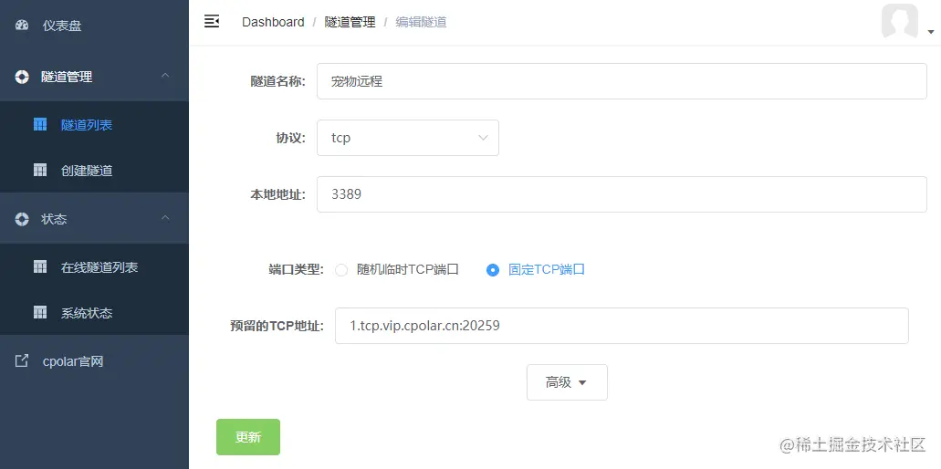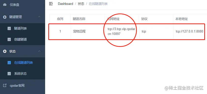 完成这一步后,我们点击cpolar客户端左侧“状态”项下的“在线隧道列表”,这里我们就能看到远程计算机访问本地计算的关键,即公网地址。