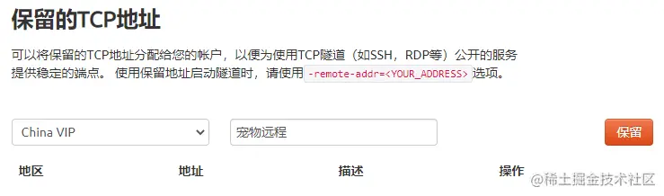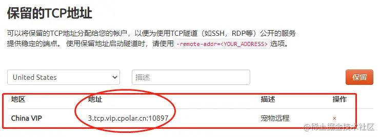 由于是空白隧道,因此我们不必过多设置,只要设定服务器位置(为保证数据流稳定,最好选择位置靠近自己的服务器)和数据隧道的说明备注即可。这里例子中,我们将数据备注为“宠物远程”,服务器则选择China vip,再点击右侧的“保留”按钮,完成空白数据隧道的设定。空白数据隧道保存成功后,就会生成一个“地址”,这个地址是我们在cpolar客户端设定的关键,因此可以复制保存。