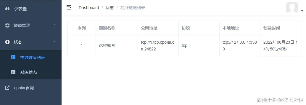 接着,我们点击cpolar客户端左侧“状态”项下的“在线隧道列表”,取得这条隧道的公共互联网地址,这个地址可以让我们在公共互联网电脑上连接到家里电脑,因此可以看做是数据隧道的“入口”。