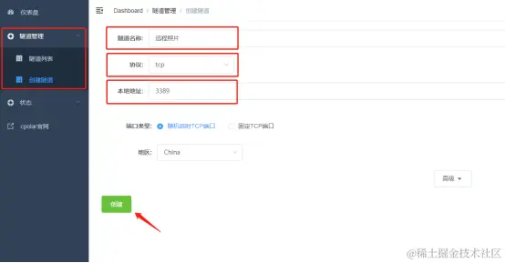 在这个例子中,由于我们的隧道主要用来查看和编辑照片,因此我们将这条隧道命名为“远程照片”,协议栏位我们在下拉菜单中选择“TCP”,本地地址填写需要映射的内网端口即可,如本例中为远程桌面,则填写远程桌面的端口号3389,而端口类型暂时选择随机临时TCP端口。完成这些设置后,点击下方的“创建”按钮,完成数据隧道的建立。