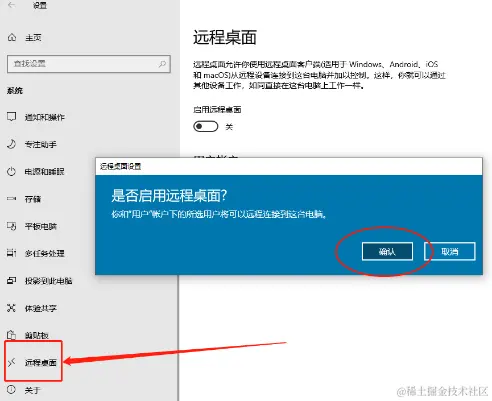 在取得这个地址后,还需要打开本地电脑的“允许远程桌面”开关,我们可以在本地电脑的“设置”中,找到“远程桌面”选项。