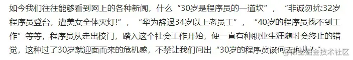 程序员到了30岁是一个非常尴尬的年龄,大部分企业对于30岁以上的程序员都会比较迟疑。面试碰壁,感觉到受挫,如果面的又是自己非常想去的公司,会更加的难过。而内心恐慌可能是多次受挫,开始陷入自我怀疑,不确定未来该何去何从,感觉很迷茫!