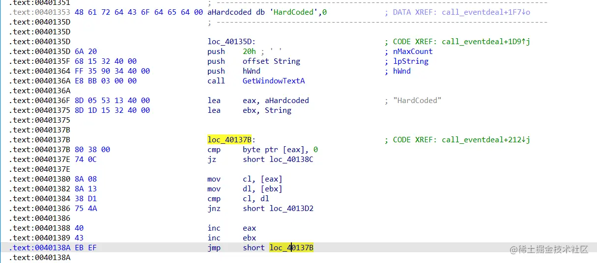往下找,发现硬编码check分支:将用户输入和硬编码:HardCoded进行比对,一致了跳转