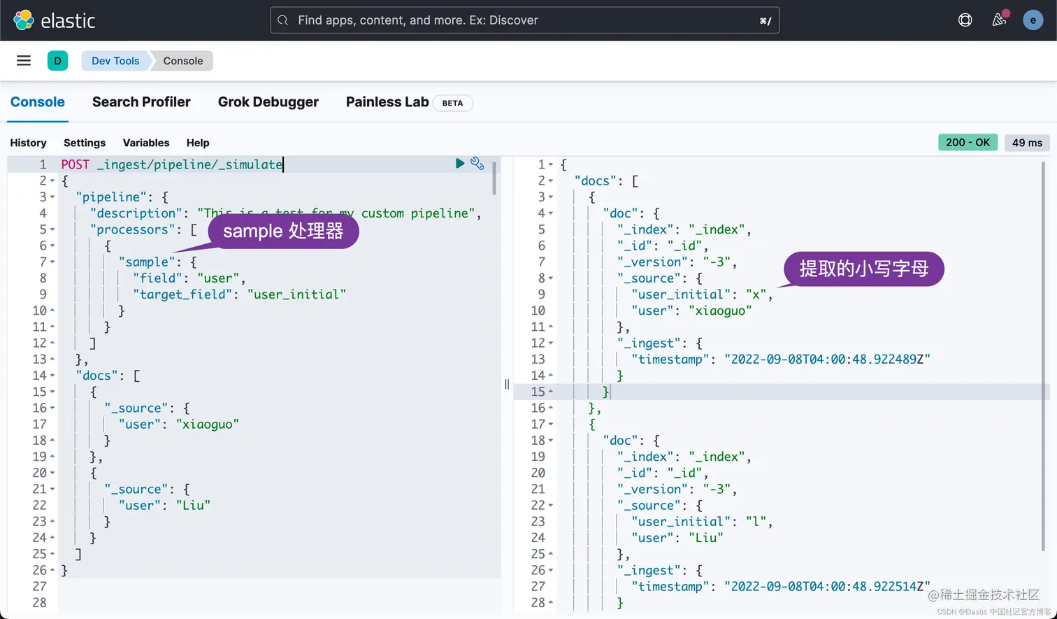 我已经详述了如和使用一些工具来生产相应的最基本的 ingest pipeline 的处理器。在今天的文章中,我进一步来通过一个例子来进行展示。在今天的展示中,我将使用最新的 Elastic Stack 8.4.0 来进行展示。我们将设计一个叫做 sample 的处理器。它可以把文档中的一个字段的首字母进行提取,转换为小写字母,并置于一个用户自己设定的字段中: