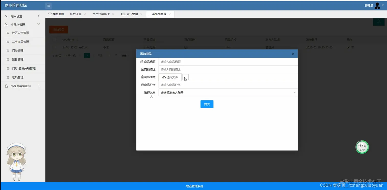 用户管理 社区公告管理、报修管理、问卷调查管理、题目管理 选项管理等功能