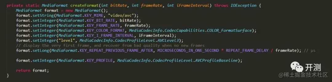 其中profile_idc等于100表示码流是High档次,profile_idc等于66表示码流是baseline档次。码流的取值是由手机硬件决定的。通过阅读scrcpy源码发现ScreenEncoder文件中有个createFormat私有方法可以指定视频流数据的格式,因此我们修改该方法的代码,人为的将视频流数据格式化为baseline,具体代码如图2所示。