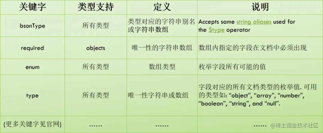 为了增强 3.2 版本 validator 功能 MongoDB 3.6 提供了 JSON Schema 进一步完善校验规则
