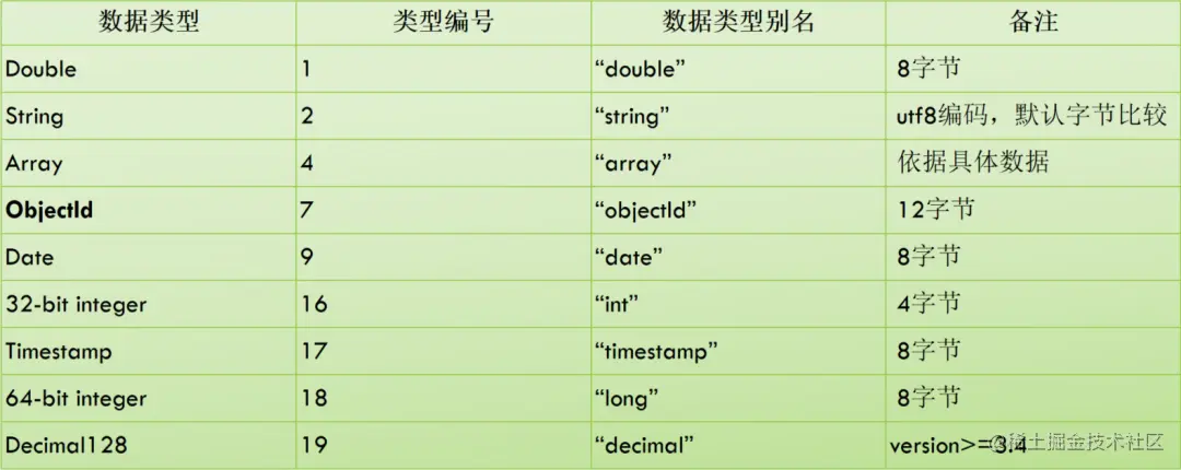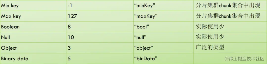 列表里面是 MongoDB 常见或者不常见的一些数据类型,可能大部分人没有详细地去梳理过,可以去仔细了解一下做参考。(可能有些不是 100% 的准确)