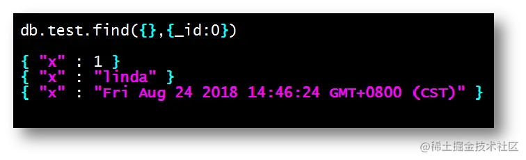 插入一条合法文档并使用 db.test.find({},{_id:0}) 查询结果必须如下: