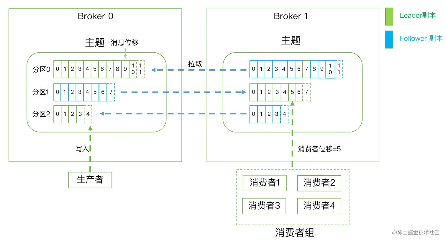 消息位移:Offset。表示分区中每条消息的位置信息,是一个单调递增且不变的值。