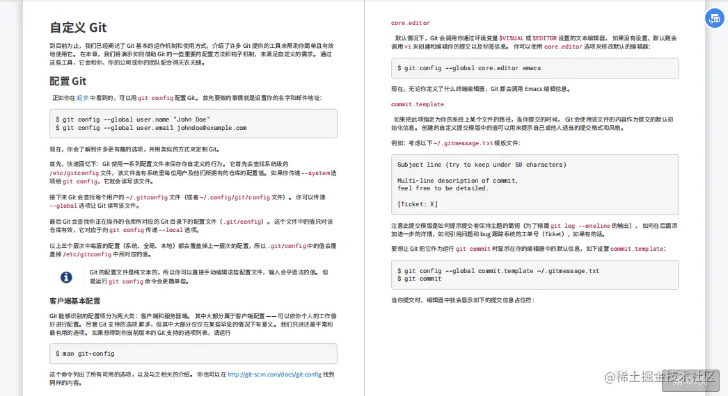 关于 Git 环境的自定义配置,包括设置用于增强或促进自定义策略的钩子脚本, 以及按照你所需要的方式进行工作的环境配置。我们还会介绍构建你自己的脚本集,以增强自定义提交策略。