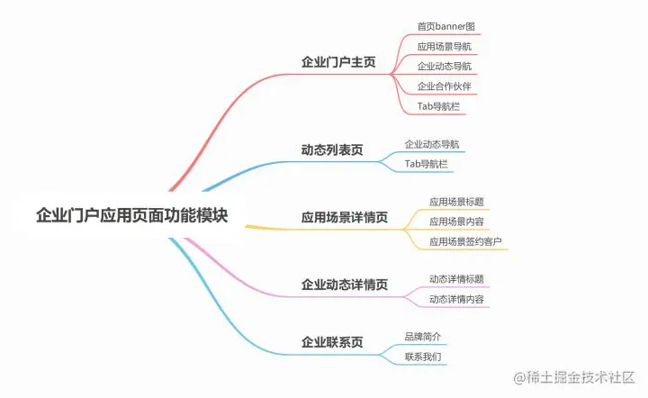 企业门户应用一共由五个页面构成,并且不同的页面具备不同的功能模块,如下图所示: