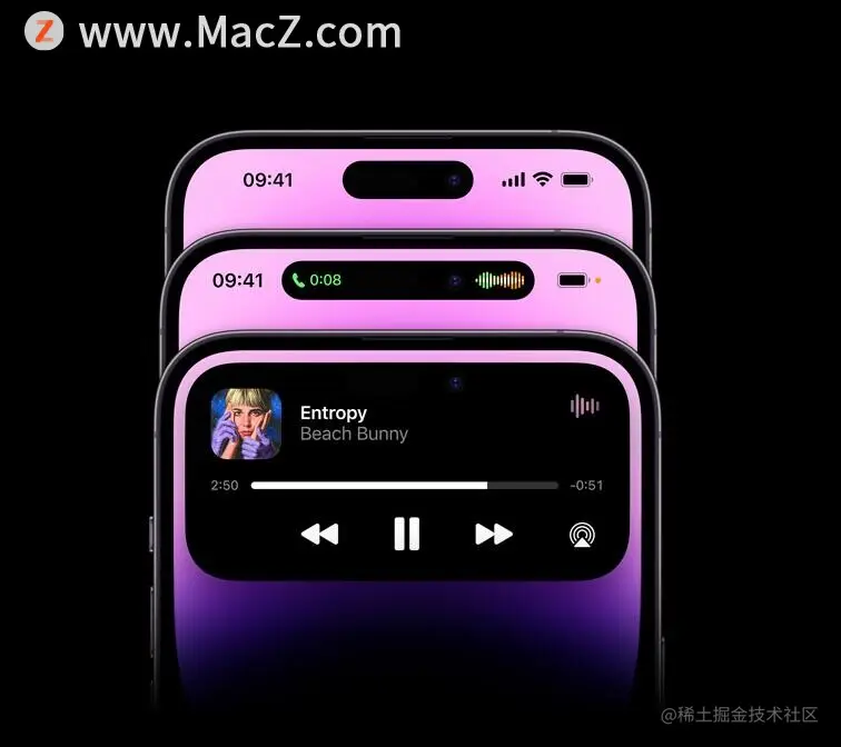 具体来说,iPhone 14 Pro 和 Pro Max 刘海变成了药丸设计(不是感叹号),苹果将其命名为“灵动岛”。苹果在灵动岛区域带来全新的交互方式,模糊了硬件和软件的界限,实时变化显示重要的提醒、通知和活动以及AOD 息屏显示等功能,个性十足。