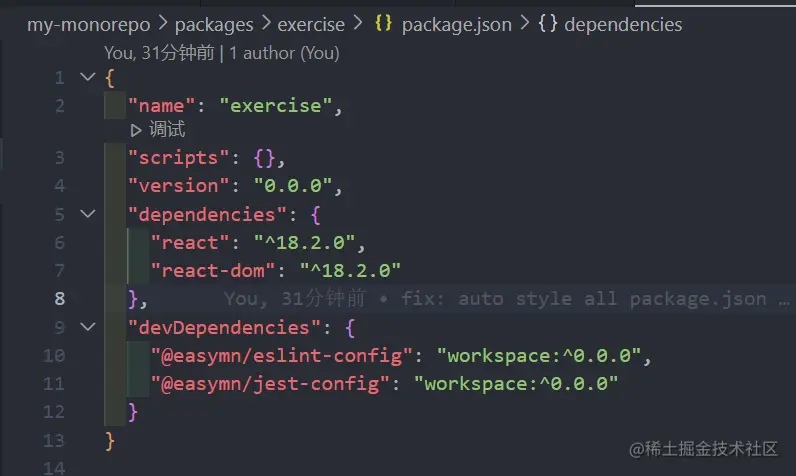 比如有一个package/exercise项目需要获取eslint配置,只需要在其devDependecies中声明对应依赖来自workspace: