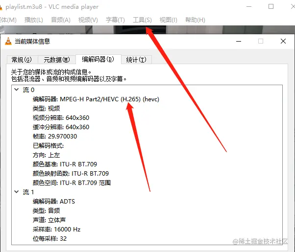 我们可以将视频流接入VLC播放器里查看。点击【工具】-【媒体信息】-【编解码器】,即可看到当前视频流包括编码在内的音视频等参数信息。
