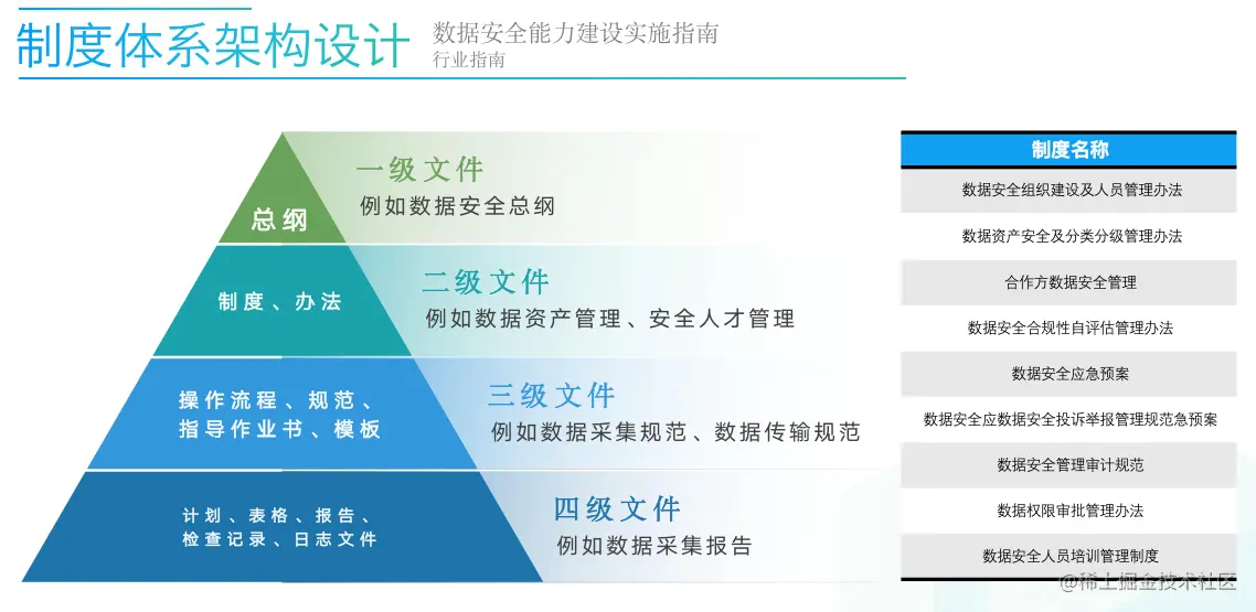 在构建数据安全管理体系的过程中,可能面临资源不足、跨部门协作效率不高、安全与业务之间的利弊平衡等各种挑战,单纯依靠数据安全部门难以达到理想的管理成效。《个人信息安全规范》和《数据安全法》相关政策法规明确要求,企业应建立数据安全管理委员会,并制定一系列数据安全合规管理制度,实现数据从“人治”到“制治”的转型。