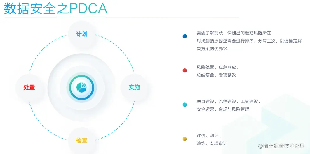 分析主要从三个方面入手,即业务需求调研、用户需求调研和技术方案调研。科学评估当前企业的安全现状,并对存在的问题进行溯源拆解,是开展数据安全管理最关键的步骤。评估是一项周期性的工作,建议每年固定做一次,从计划到实施、从检查评估到整改、从应急响应到复盘规划,往复循环,查缺补漏,以此优化安全能力框架体系。