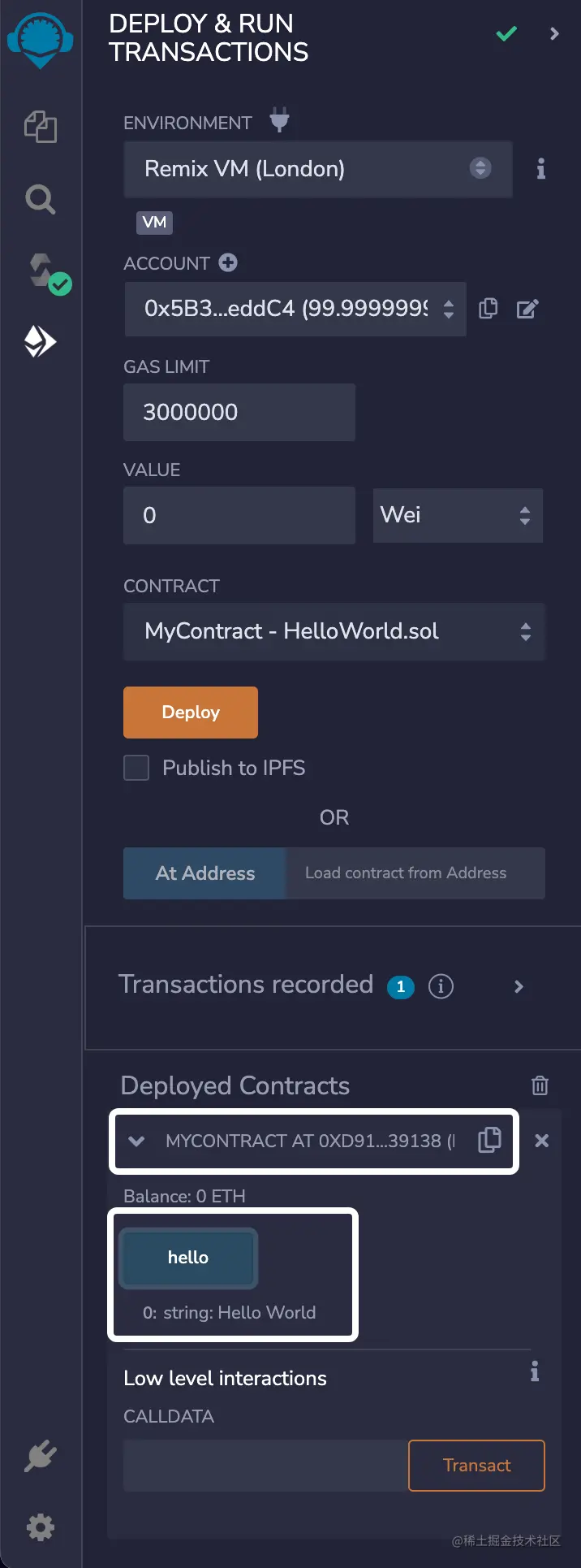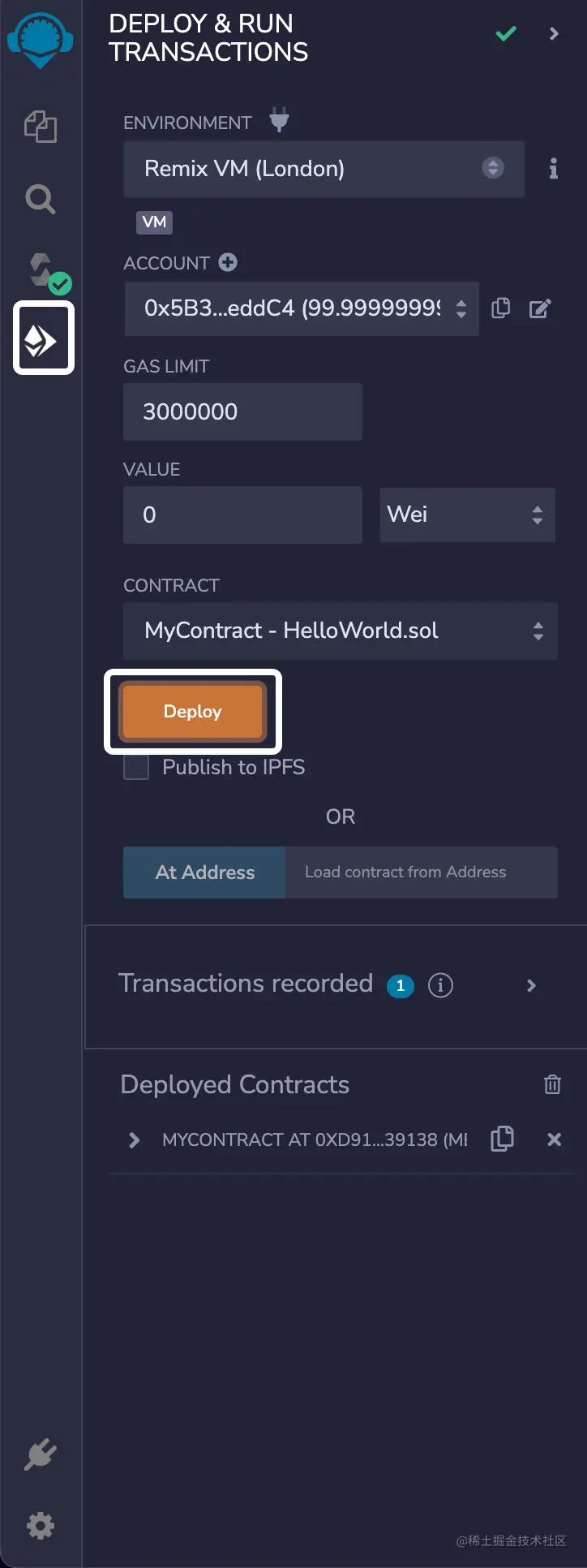 部署成功后,在 Deployed Contracts 中会有一个地址。