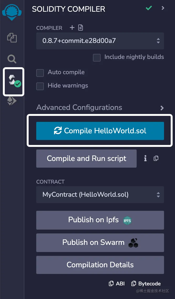 我们不需要修改任何设置,点击 Compile HelloWorld.sol 即可。