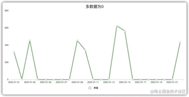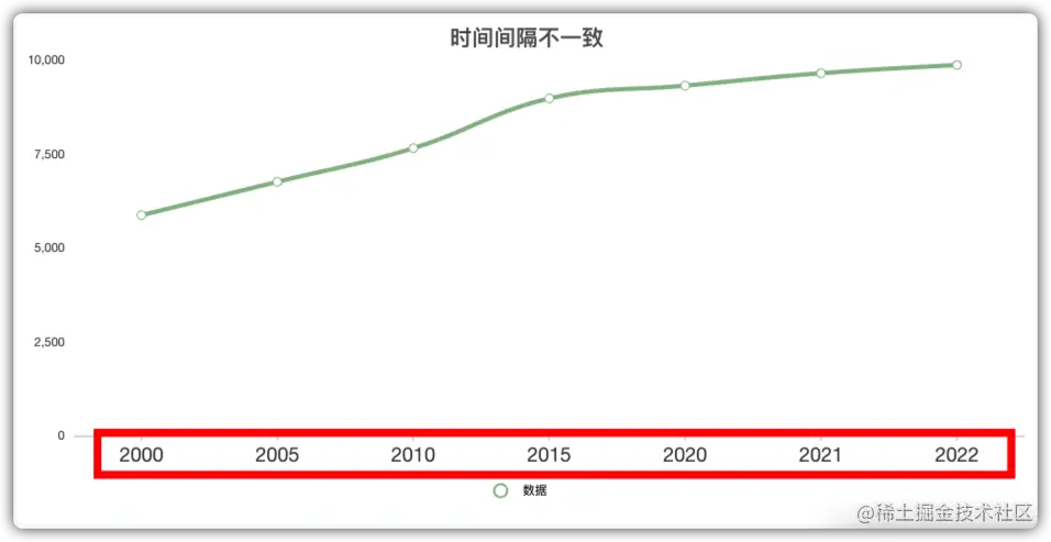 当你以时间作为 x 轴画折线图时,数据必须有着一致的时间间隔。否则数据会产生误导(例如下图所示)。画图时需务必保证时间间隔的一致性。